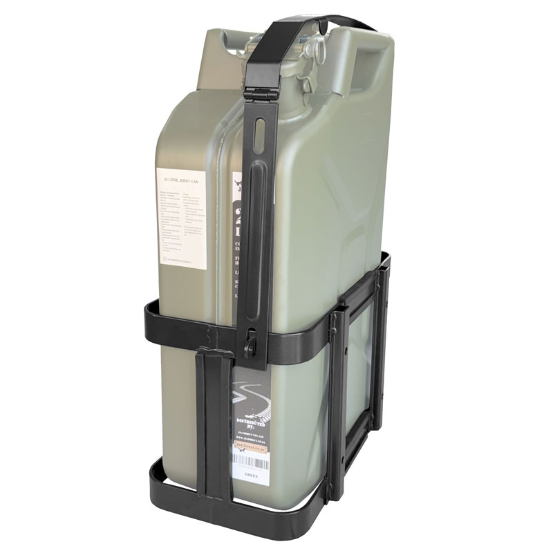 Secure metal bracket for 20 L Badger Jerry Cans. Made to fit standard cans — note that cans with raised side seams may not slot in properly. Keep your can mounted cleanly and securely.